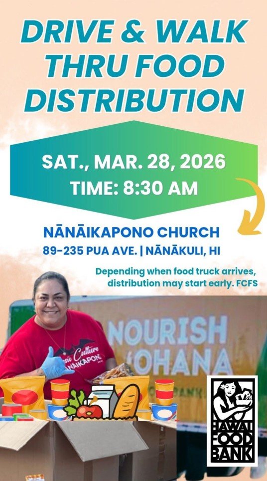 The Hawai'i Foodbank will have a Drive & Walk Thru Food Distribution at Nanaikapono Church in Nanakuli.