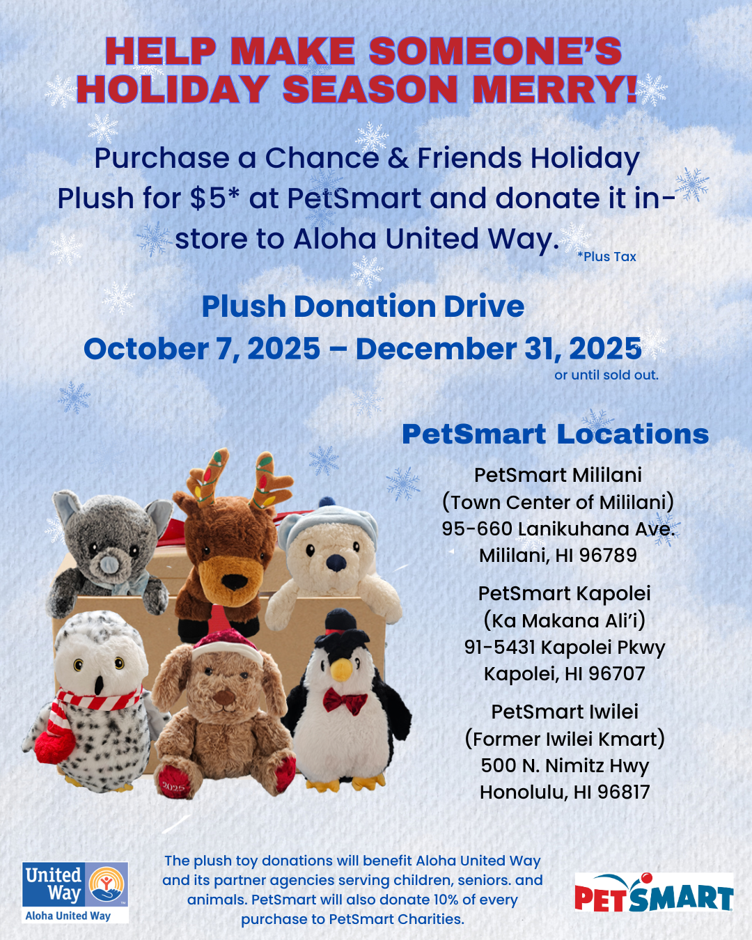 Through the PetSmart Holiday Plush Toy Drive, you can make a real difference by purchasing Holiday Chance & Friends plush toys for just $5 (plus tax) at any Oʻahu PetSmart location and donating it at the register to Aloha United Way or through drive-up pick up and letting the staff know you want to donate it to AUW. In addition to your donation of the plush toys, 10% of the sale of these holiday plush toy purchases will benefit PetSmart Charities.